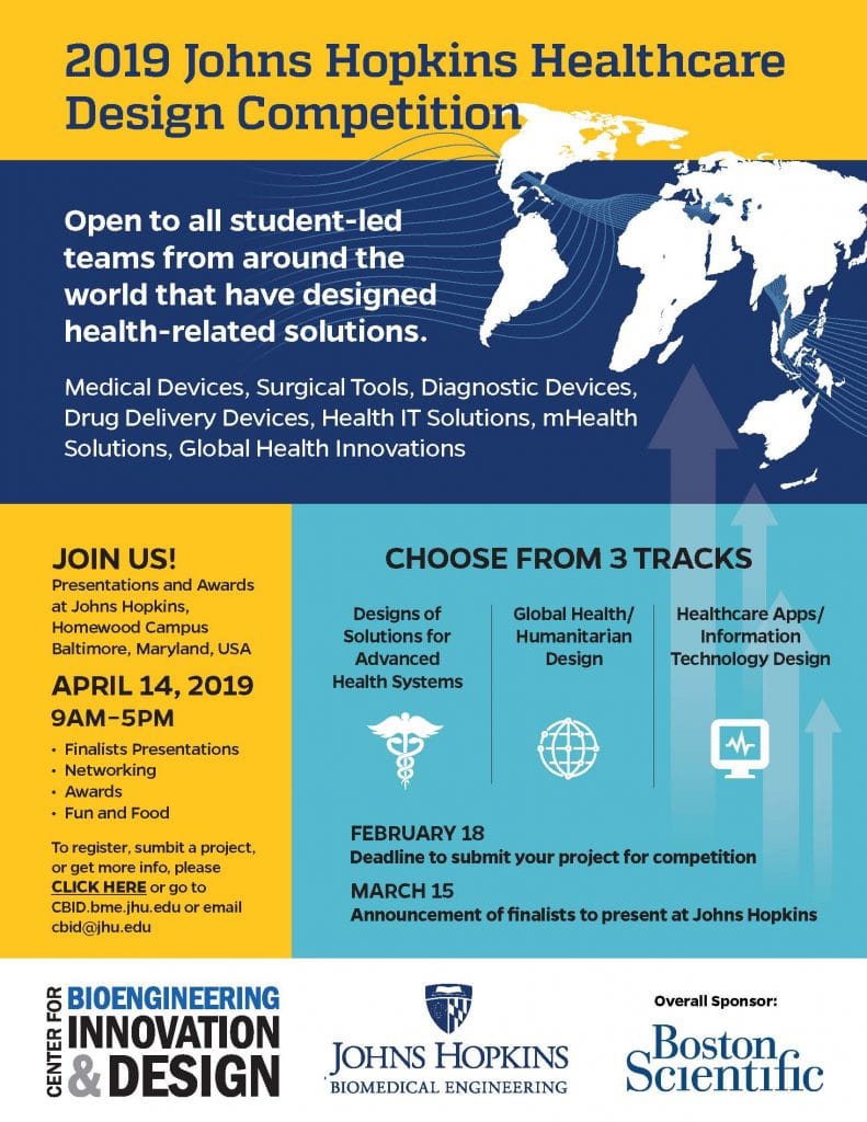 JHU CBID is hosting the 2019 Johns Hopkins Healthcare Design Competition this spring. JHU CBID is seeking student lead teams to apply across three tracks- Advanced Health/Global Health/Health IT. Application Deadline: 18th February 2019 Competition Tracks: Designs of Solutions for Advanced Health Systems Global Health/ Humanitarian Design Healthcare Apps/Information Technology Design Type: Contest Eligibility: Project […]